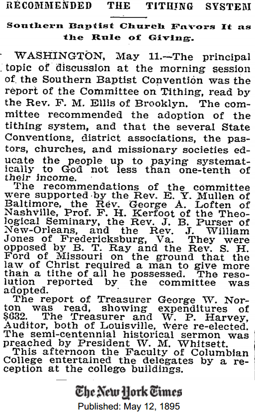 El principal tema de discusión en la sesión matinal de la Convención Bautista del Sur fue el reporte del comité sobre diezmar… El comité ha recomendado la adopción del sistema de diezmos, y que varias convenciones estatales, asociaciones distritales, pastores, iglesias y sociedades misioneras, eduquen a la gente a pagar sistemáticamente a Dios no menos que un décimo de sus ingresos.